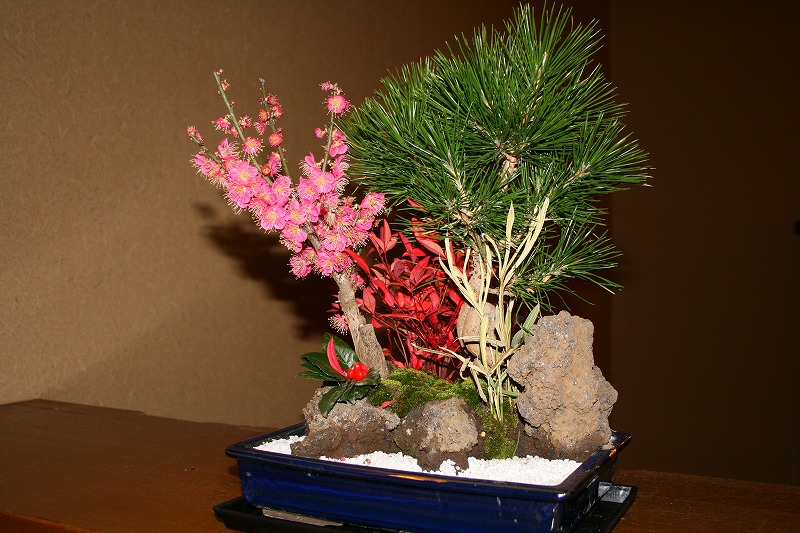 昨年暮れにホームセンターで購入した「お正月飾り」です。 当館二階に飾っています。 その中の紅梅が綺麗に咲きました。 他の植物に先駆けて寒中に花が咲く「紅梅」は見とれてしまいます。