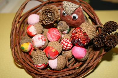 秋に拾っておいた「どんぐり」の帽子に古布を入れた