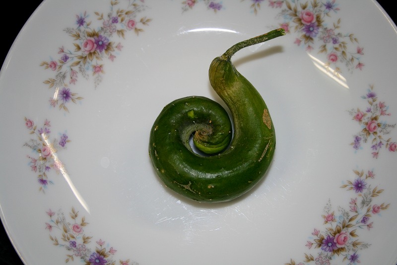7月23日に、成長したキュウリの先端から咲いた珍しい花を紹介しましたが 今度は、こんなキュウリが出来ました。 カタツムリのように見えます。 絶対に市場に出回らないですね!
