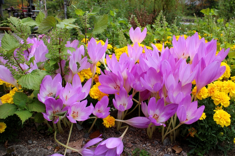 深山荘への つり橋「かじか橋」の綱株横に生えています。 最初この葉のない 花だけの名前はなんだ・・・? お客様に教えて頂きました。 「コルチカム」 忘れそうです。