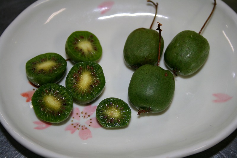 サルナシ こちらでは「こくぼ」と呼んでいます。 実が熟し美味しくなって来ました。 味も形もキウィフルーツそのもので ただ小さいだけです。 山々を良く見渡しますと所々に生っています.