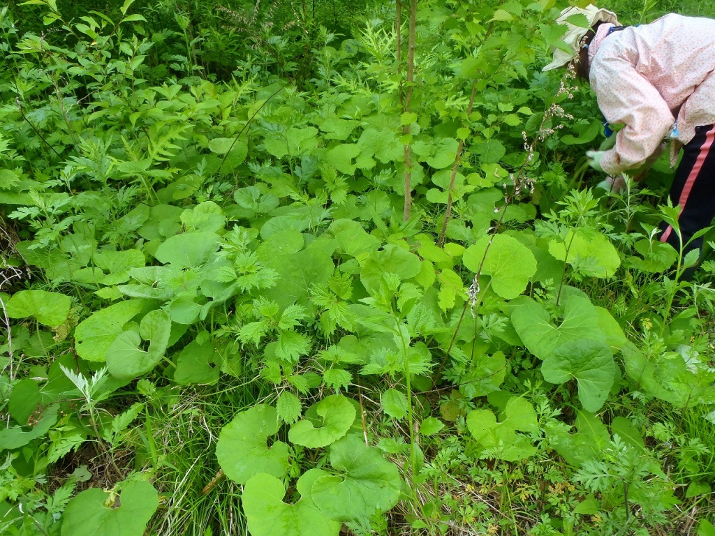 フキ採りにやって来ました。昨年と同じ場所で辺り一面フキ畑です。 ただ変わってきたのは、木々が大きくなってきたため 日の当たらなくなって来たところのフキが徐々に減ってきた事です。 このフキはお客様の朝食の一品「キャラブキ」になります。