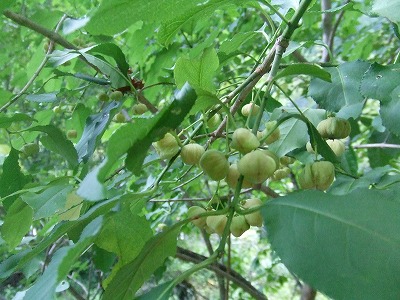 マユミの木がありました。 これ9月18日の写真です。 果実が枝にぶら下がるようにして着いていました。 名前の由来が 「弓」の材料から来たという事です。 それが