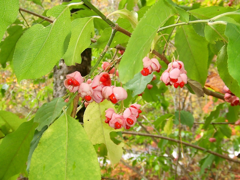 果実の色は「薄紅」 熟して果皮が4つに割れ、鮮烈な赤い種子が4つ現れました。 近くで見ると とても綺麗です。