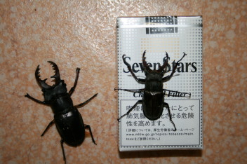 体長60mmと45mmです。1週間程前、同じ日にお客様に頂いたものですが、大きい方は、どういうわけか足の先が取れてしまいました。かわいそうでしたので、逃がしましたがそろそろミヤマクワガタの時期は、終わりこれからはアカアシクワガタが多く見られる様になります。