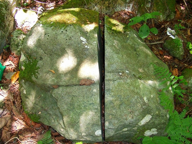 山を歩いていましたらこんな石がありました。 縦に約80㎝、深さ約40㎝に渡って、スパッと割れていました。 断面は真っ平、こんな所に機械は持ち込めないし こんなに深く切るには、水の力で切るしかありません。 不思議だったので、撮ってみました。