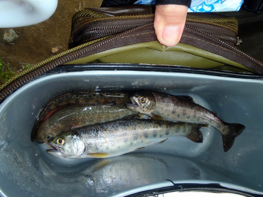 昨日の太公望の内一人のお客様に釣果を撮らせて頂きました。大きいので約20数センチの岩魚、山女魚一匹です。