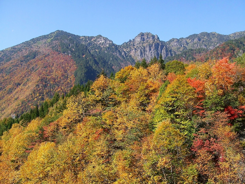 拾いに来たところから見えます紅葉です。 中央右に標高2,168mの「錫杖岳」が見えます。