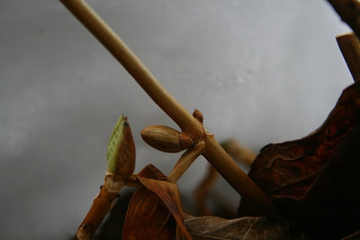 左側の芽は霜にあたり茶色くなっていますが、
