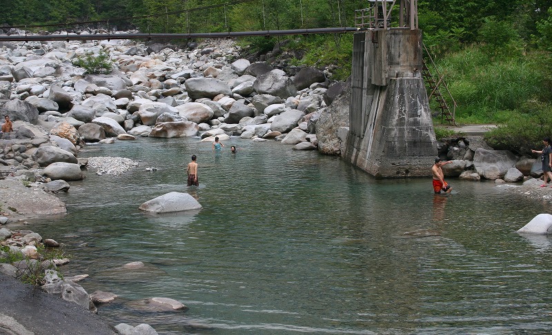 蒲田川の水量が減り、水温が高くなって来ました。 温泉プール感覚で泳ぐには丁度良いです。 この暖かい範囲は深山荘を中心に約1・5㎞に渡っています。 雨が降るとダメですが、今が一番面白いです。