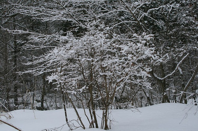 写真は湿った雪が木々に付着し、幻想的な景色と
