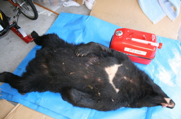体長約140cm、体重約80キロの雄熊です。 歯が綺麗なため若い熊だそうです。 深山荘より下流、約20km笠谷という所で 国道より車で道のない所まで行き、 そこから徒歩で1時間