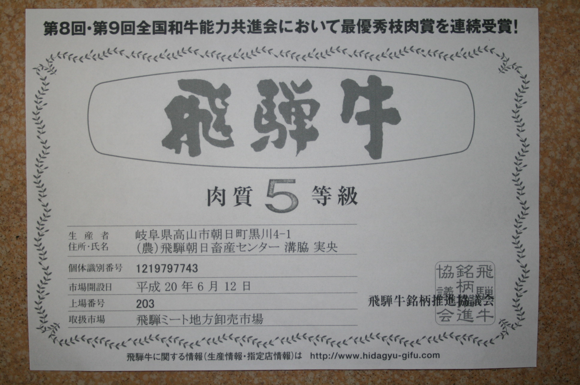 これは深山荘で仕入れています肉質の等級の証明書を「ながせ食品」様より頂きました。 通常4〜5等級になるそうです。