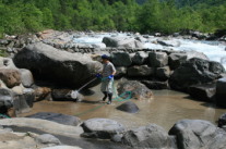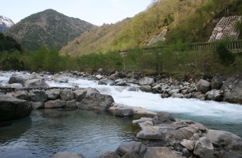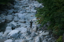 深山荘前の蒲田川は普通の川と違い、温泉の流れ込みと、温泉が川底から湧き出ているため水温が高く、そのため藻が発生してきます。